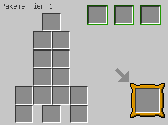 The Tier 1 Rocket is crafted using the NASA Workbench, to craft it you must fill up all the respective slots on the workbench. The Rocket requires one Nose Cone, four Rocket Fins, one Rocket Engine, and eight Heavy Duty Platings. You can fill the top right slots with chests to increase the storage space to 18, 36 and 54 slots. You can get a pre-fueled version of every spaceship from the creative mode tab.